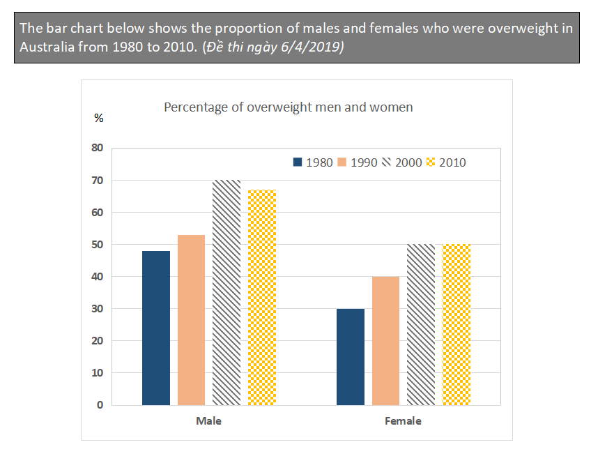 | The bar chart displays the changes in the proportion of people being overweight for both genders in Australia over a 30-year period from 1980 to 2010.