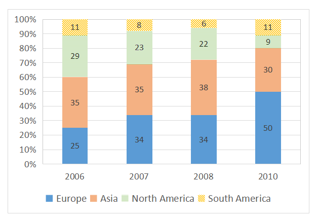 The bar chart shows the percentage of car manufactures’ total car sales in different regions from 2006 to 2010. The bar chart reveals the changes in the proportion of cars sold by car producers in four different parts of the world between 2006 and 2010. Overall, European and Asian car manufactures sold far more automobiles than the other two regions. In addition, Europe was the only area where the percentage of total car sales increased, almost doubling over this time…