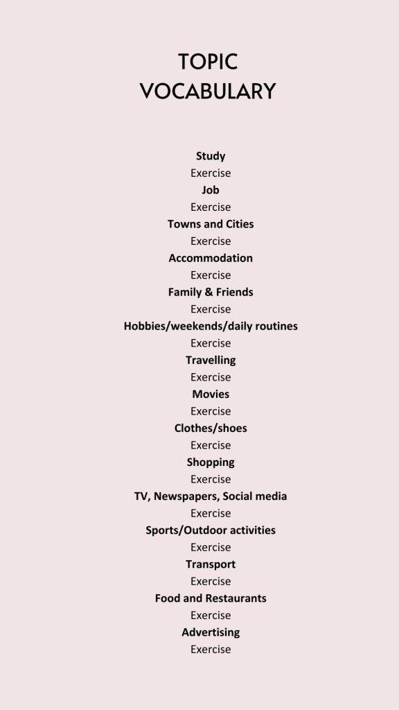 • Làm các bài tập để củng cố từ vựng cho các dạng bài và topics.